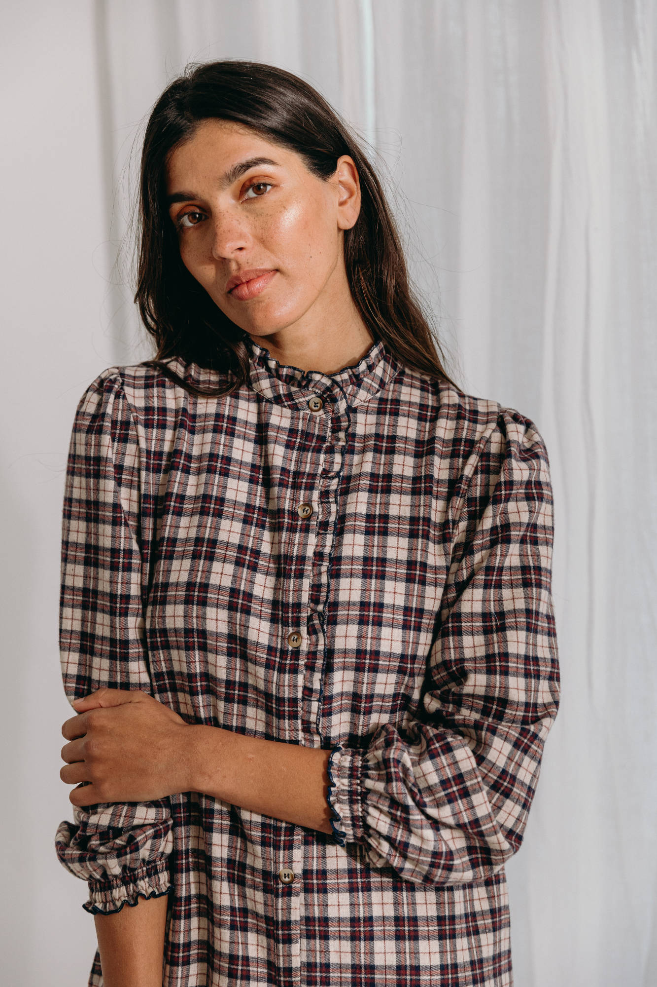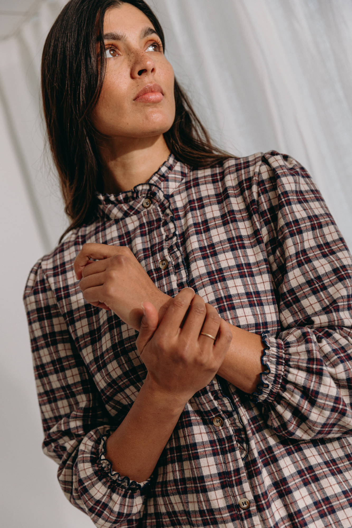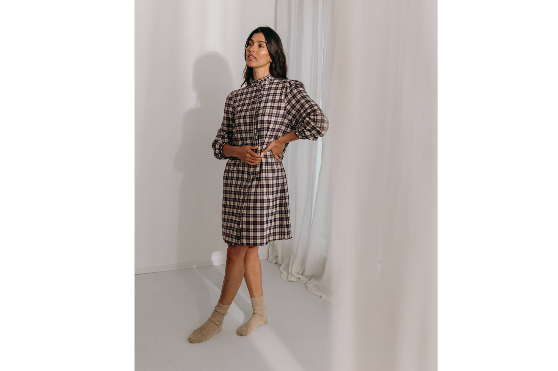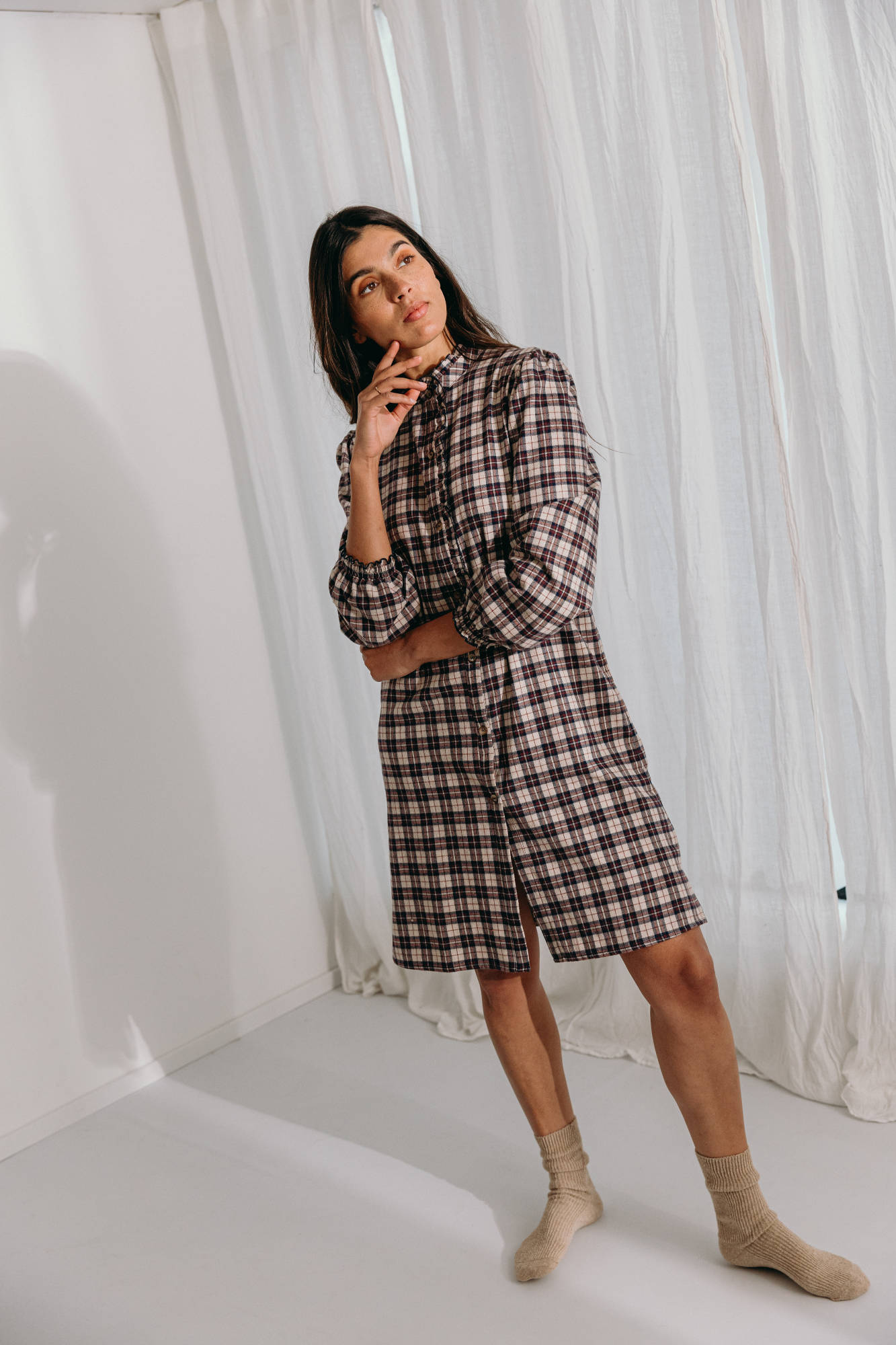 De Khloe nightdress van het Belgische merk Alice et Maman is gemaakt van luxueus zacht flanel in een opvallende pruimen/marineblauwe dubbele ruit, die comfort combineert met een verfijnde, tijdloze stijl. Subtiel smockwerk op de mouwen en verfijnde bourdonstiksels langs de opstaande kraag en langs de knoopsluiting geven het ontwerp verfijnde, vrouwelijke details. Ontworpen voor moeiteloos comfort, de volledige knoopsluiting zorgt ervoor dat de jurk volledig open kan, terwijl het relaxte silhouet prachtig valt voor serene nachten en ontspannen ochtenden. Zacht, luxueus en moeiteloos chic, de Khloe nightdress is een tijdloze aanvulling op je loungeweargarderobe.