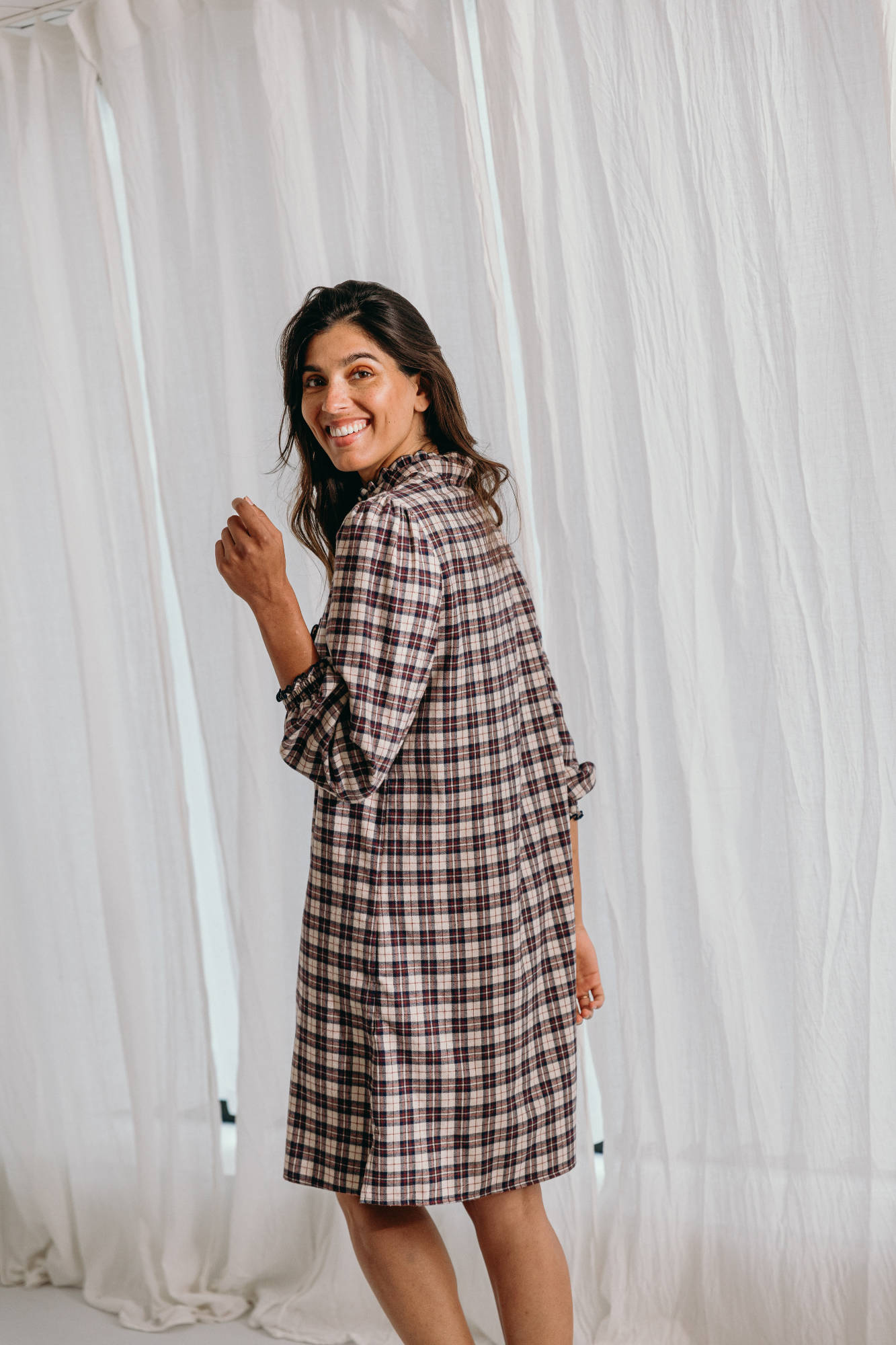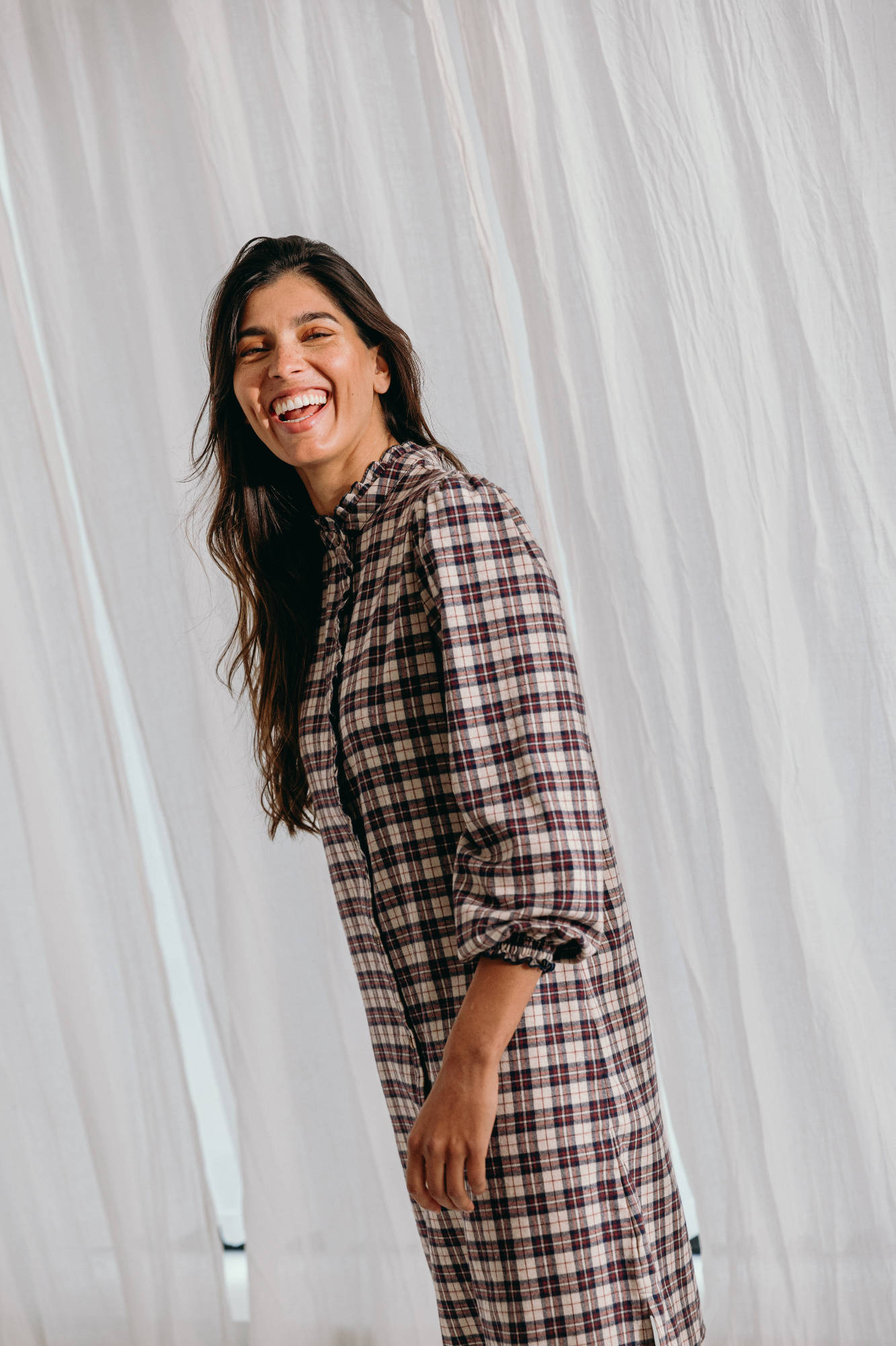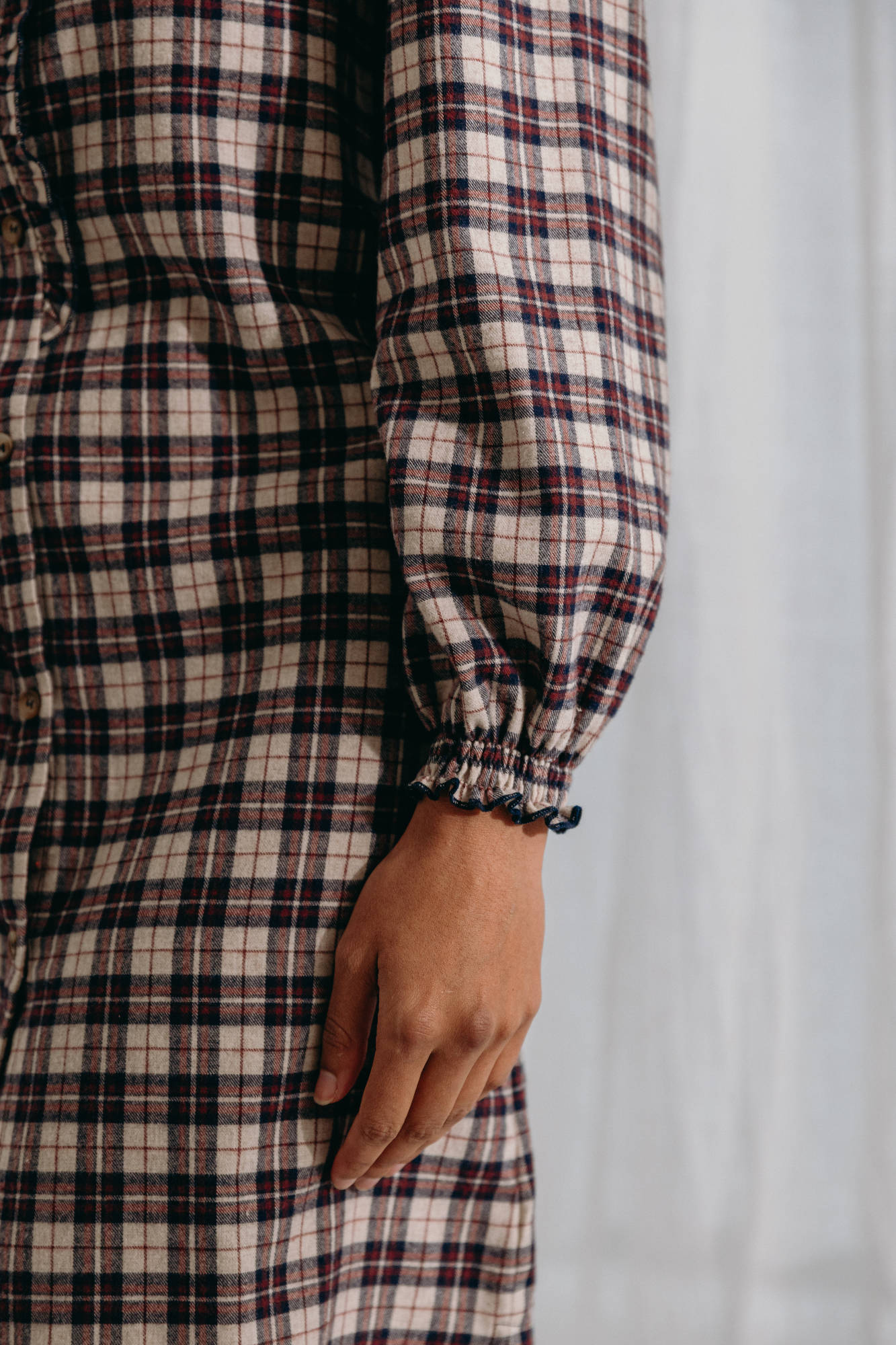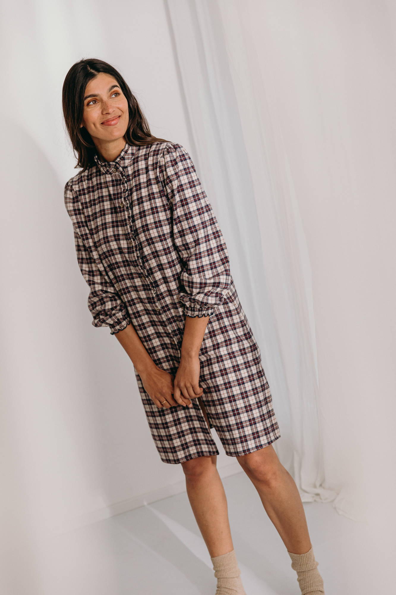 De Khloe nightdress van het Belgische merk Alice et Maman is gemaakt van luxueus zacht flanel in een opvallende pruimen/marineblauwe dubbele ruit, die comfort combineert met een verfijnde, tijdloze stijl. Subtiel smockwerk op de mouwen en verfijnde bourdonstiksels langs de opstaande kraag en langs de knoopsluiting geven het ontwerp verfijnde, vrouwelijke details. Ontworpen voor moeiteloos comfort, de volledige knoopsluiting zorgt ervoor dat de jurk volledig open kan, terwijl het relaxte silhouet prachtig valt voor serene nachten en ontspannen ochtenden. Zacht, luxueus en moeiteloos chic, de Khloe nightdress is een tijdloze aanvulling op je loungeweargarderobe.