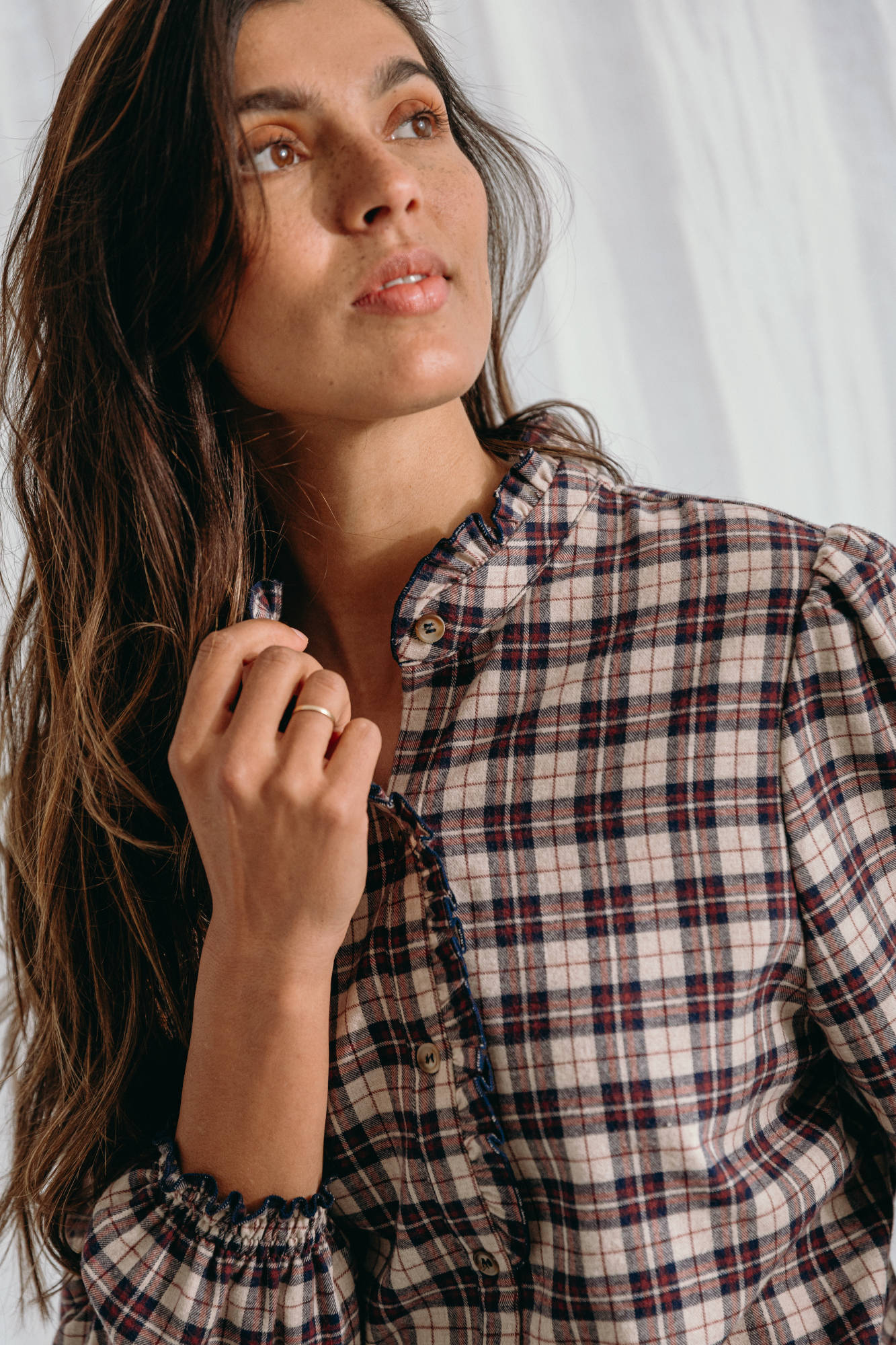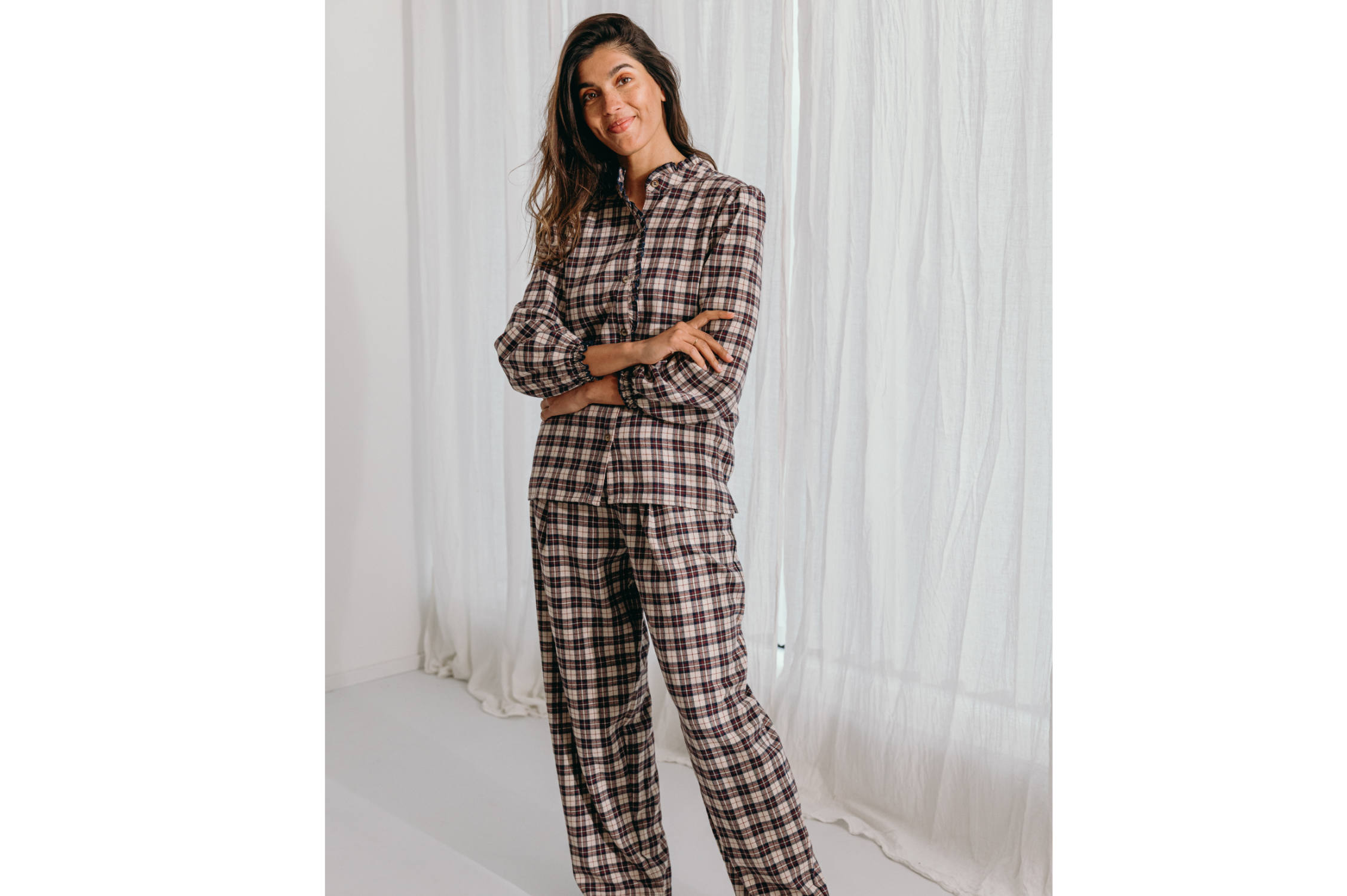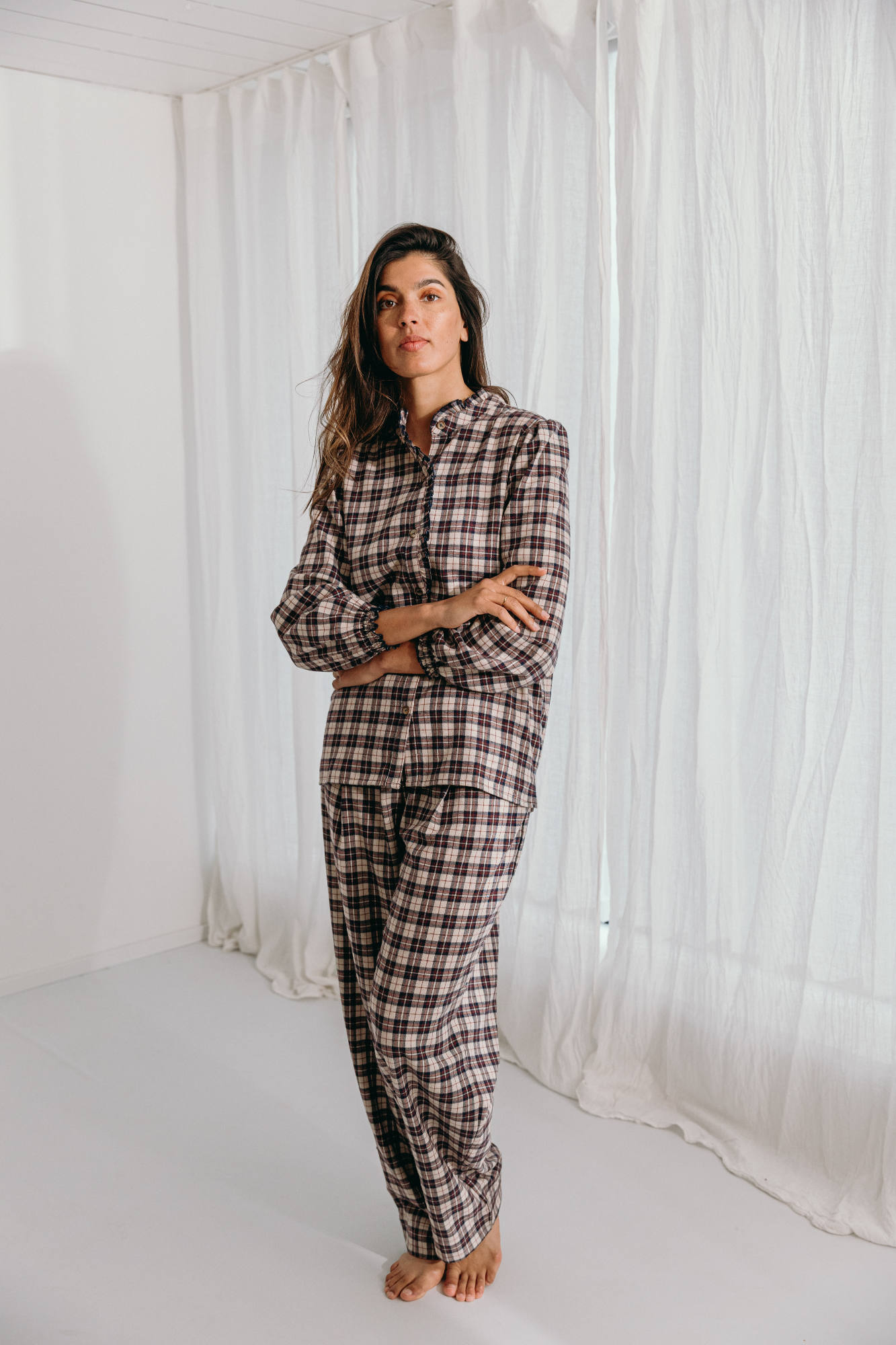 De Khloe pyjama van het Belgische merk Alice et Maman is gemaakt van luxueus zacht flanel in een opvallende pruimen/marineblauwe dubbele ruit, die comfort combineert met een verfijnde, tijdloze stijl. Subtiel smockwerk op de mouwen en verfijnde bourdonstiksels langs de opstaande kraag en langs de knoopsluiting geven het ontwerp verfijnde, vrouwelijke details. De volledige knoopsluiting maakt het mogelijk om de top volledig te openen, wat elegantie combineert met moeiteloos comfort. Zacht, luxueus en onmiskenbaar chic. De Khloe pyjama is een prachtige keuze voor serene nachten en ontspannen ochtenden.