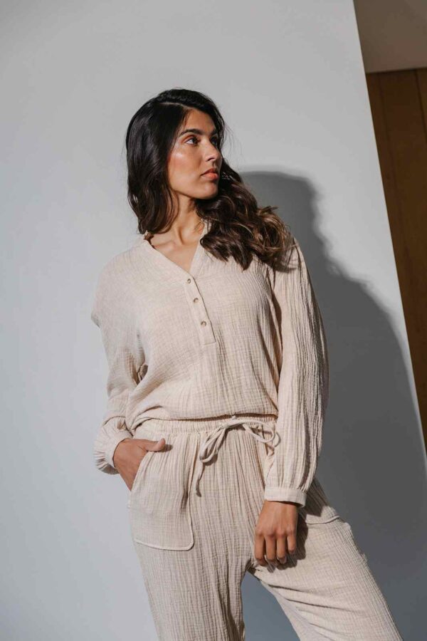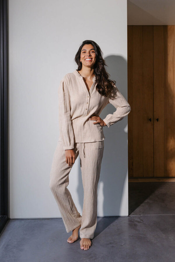 If you are looking for a pyjama that feels light, airy and feminine, Kiara is the perfect choice. Made from 100% double-faced organic cotton (often referred to as “tetra” or “double gauze”), the fabric is exceptionally soft with a naturally crumpled texture that enhances its relaxed charm. The design features a refined V-neckline with a feminine collar finished in bourdon stitching, complemented by a half button placket with fine buttons. The trousers are detailed with an adjustable drawstring and patch pockets, ensuring both elegance and practicality.