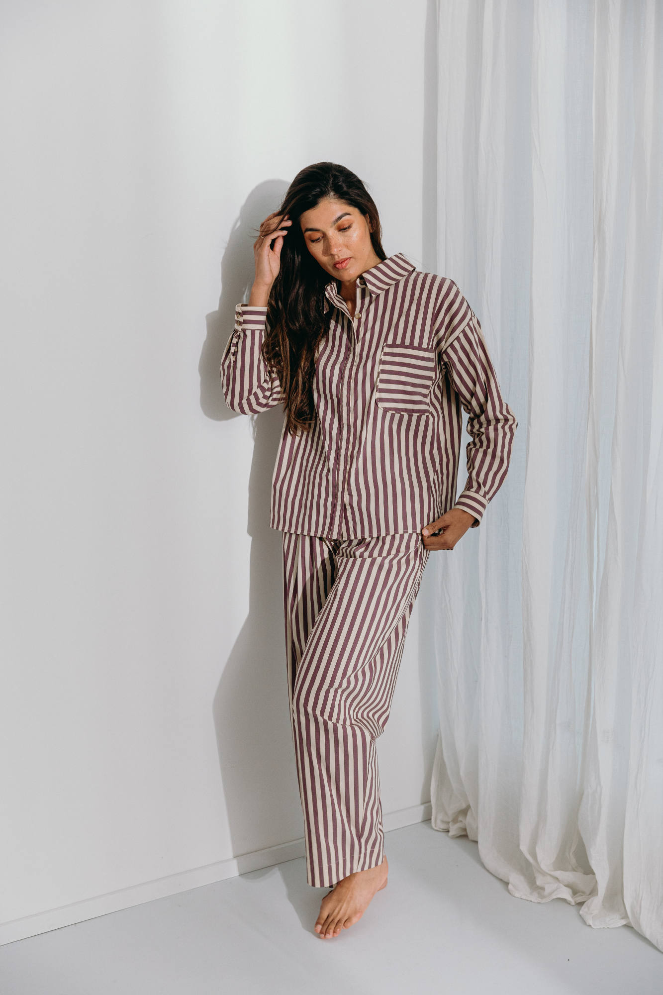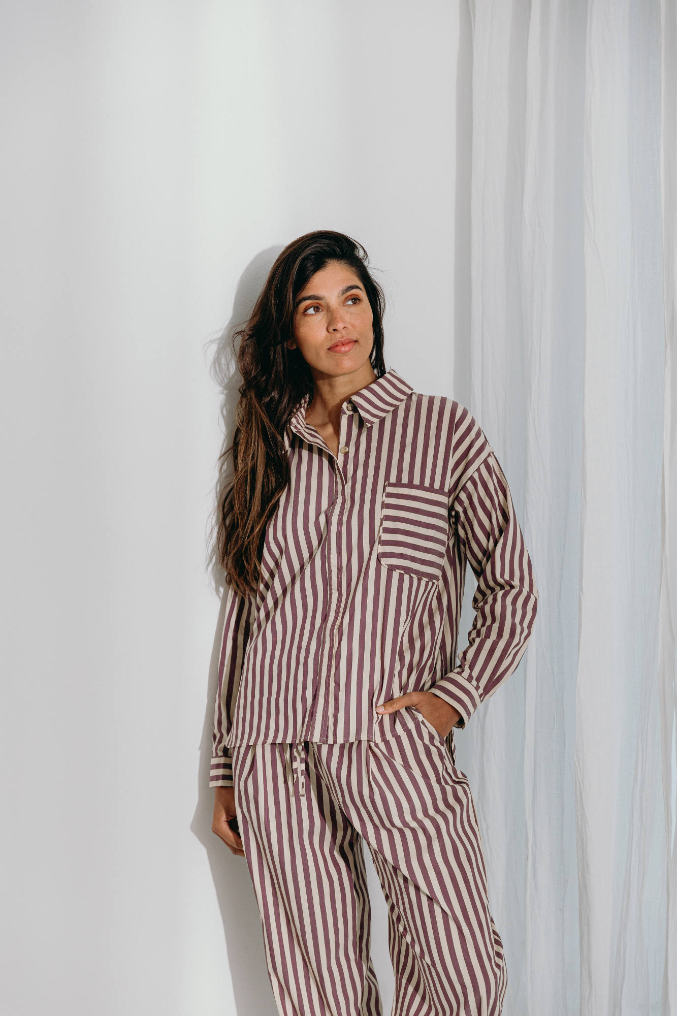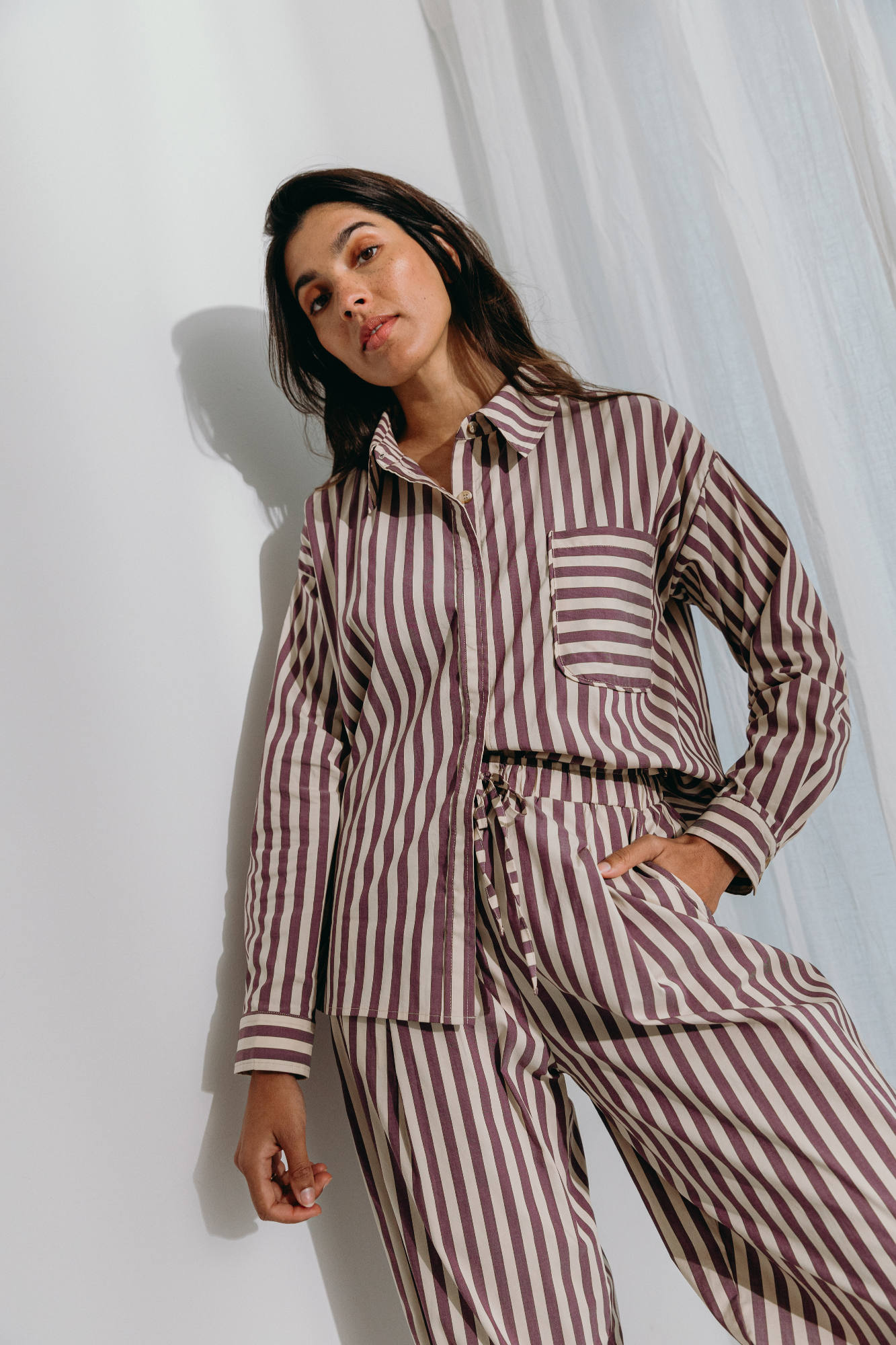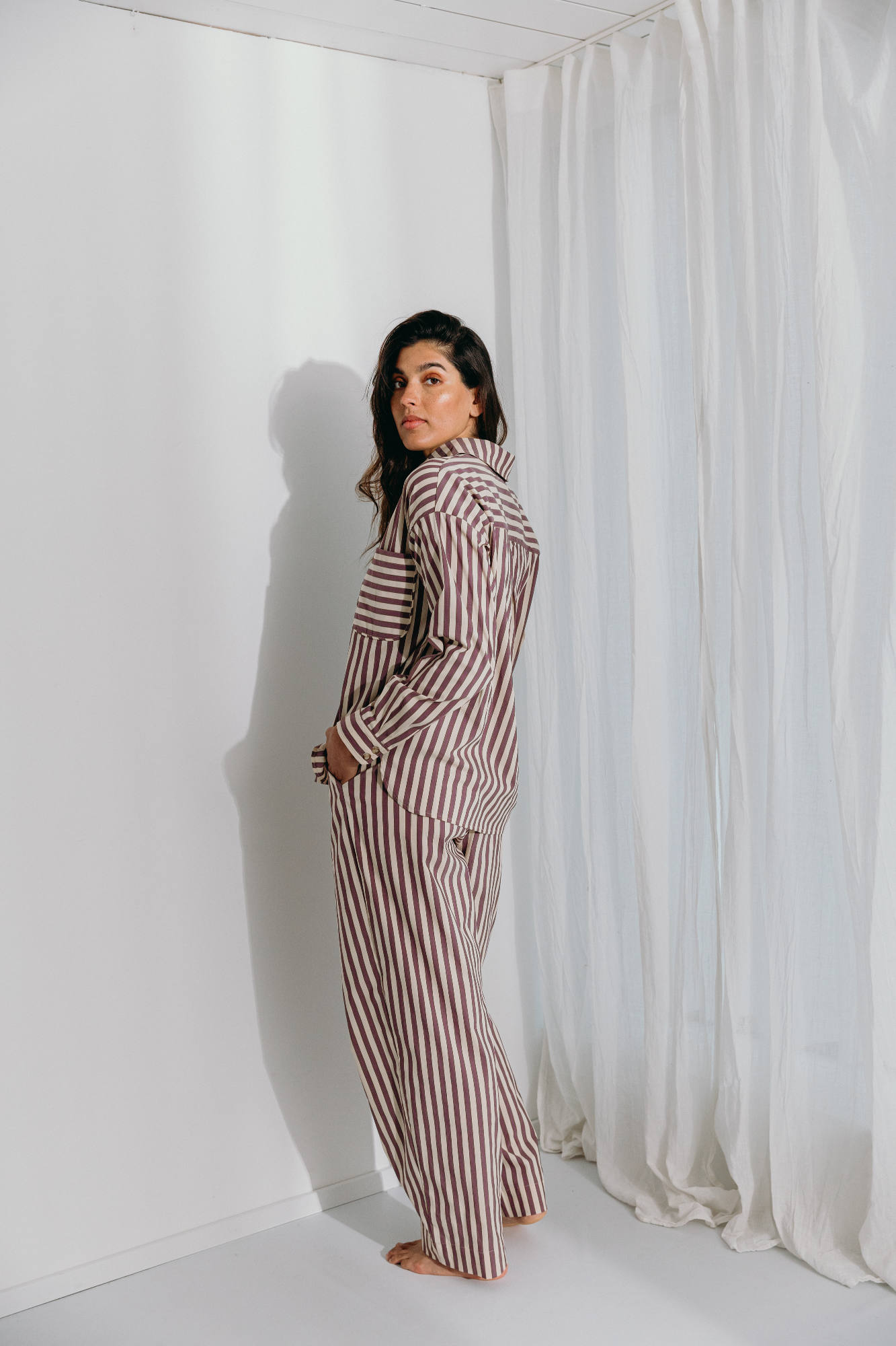 De Koko pyjama is gemaakt van luxueuze biologische stretchkatoenen poplin, die zacht en soepel aanvoelt en moeiteloos comfort biedt. Met opvallende, strakke strepen, een verborgen knoopsluiting, een grote borstzak en dubbele manchetknopen is het ontwerp eenvoudig, tijdloos en elegant verfijnd. Elk detail en de hoogwaardige afwerking benadrukken de hoogwaardige stof en het zorgvuldige vakmanschap. Een klassieke keuze voor ontspannen, stijlvolle avonden.