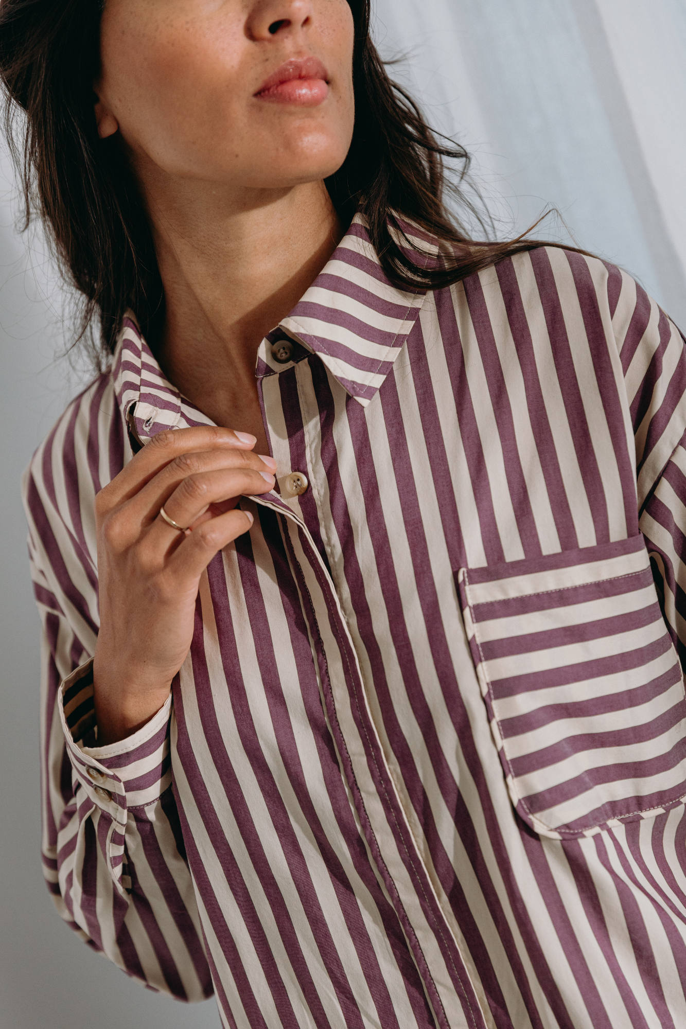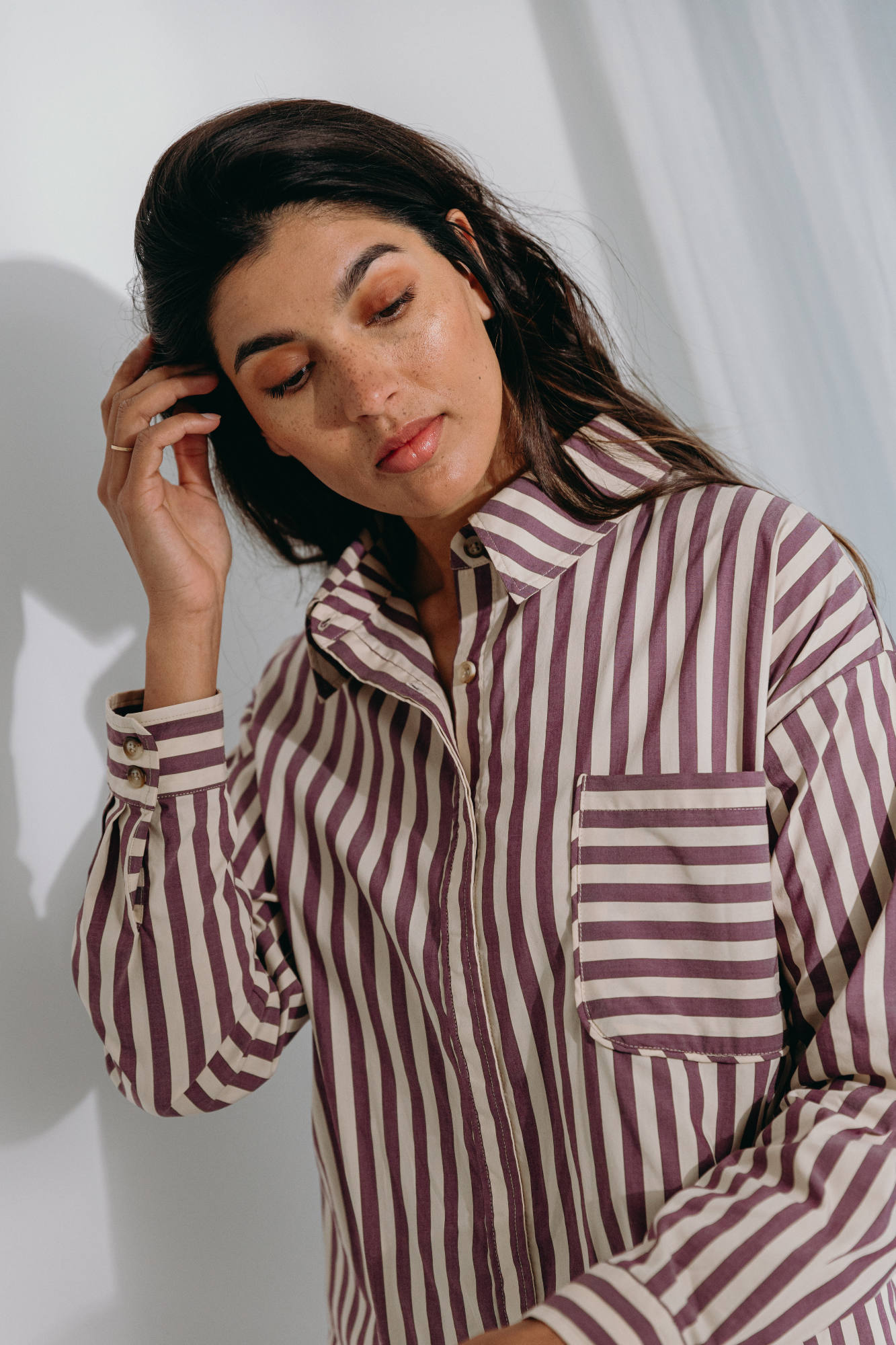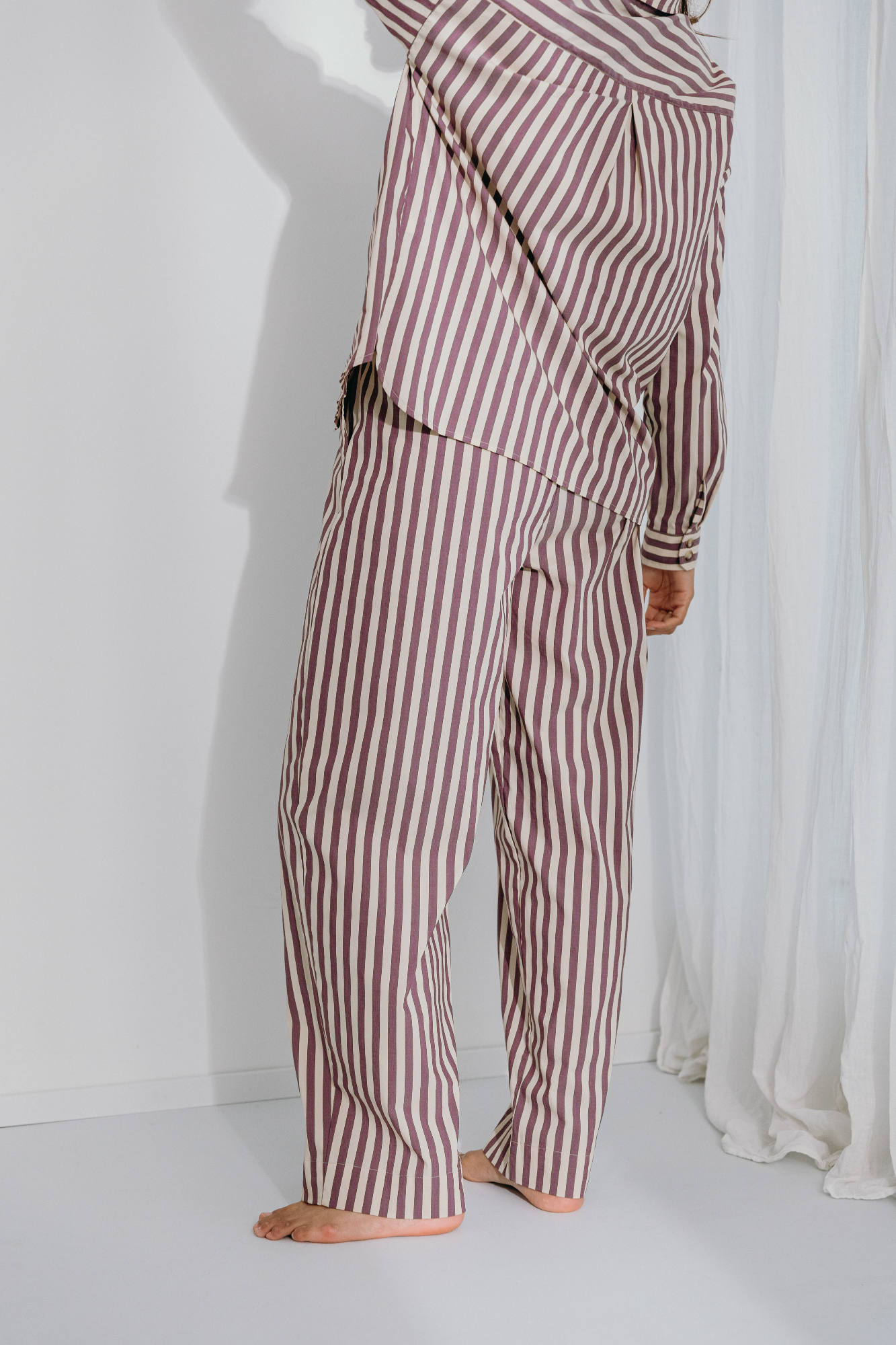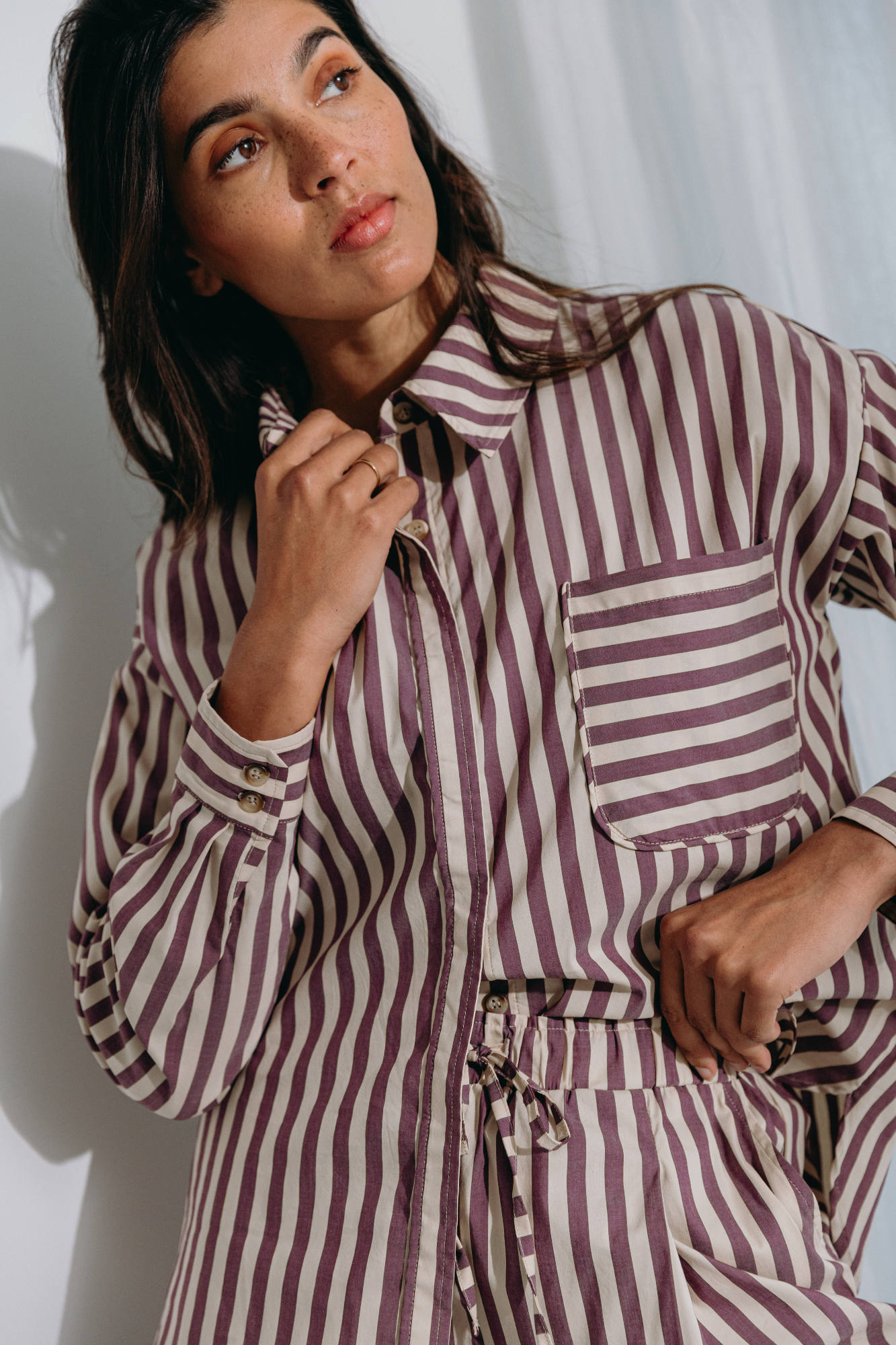 De Koko pyjama is gemaakt van luxueuze biologische stretchkatoenen poplin, die zacht en soepel aanvoelt en moeiteloos comfort biedt. Met opvallende, strakke strepen, een verborgen knoopsluiting, een grote borstzak en dubbele manchetknopen is het ontwerp eenvoudig, tijdloos en elegant verfijnd. Elk detail en de hoogwaardige afwerking benadrukken de hoogwaardige stof en het zorgvuldige vakmanschap. Een klassieke keuze voor ontspannen, stijlvolle avonden.
