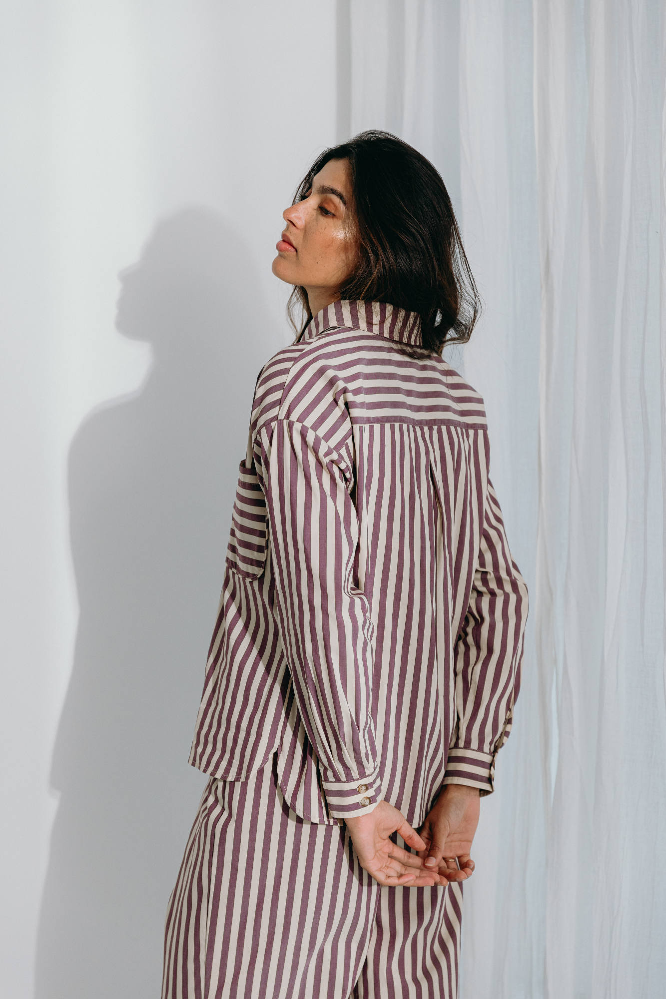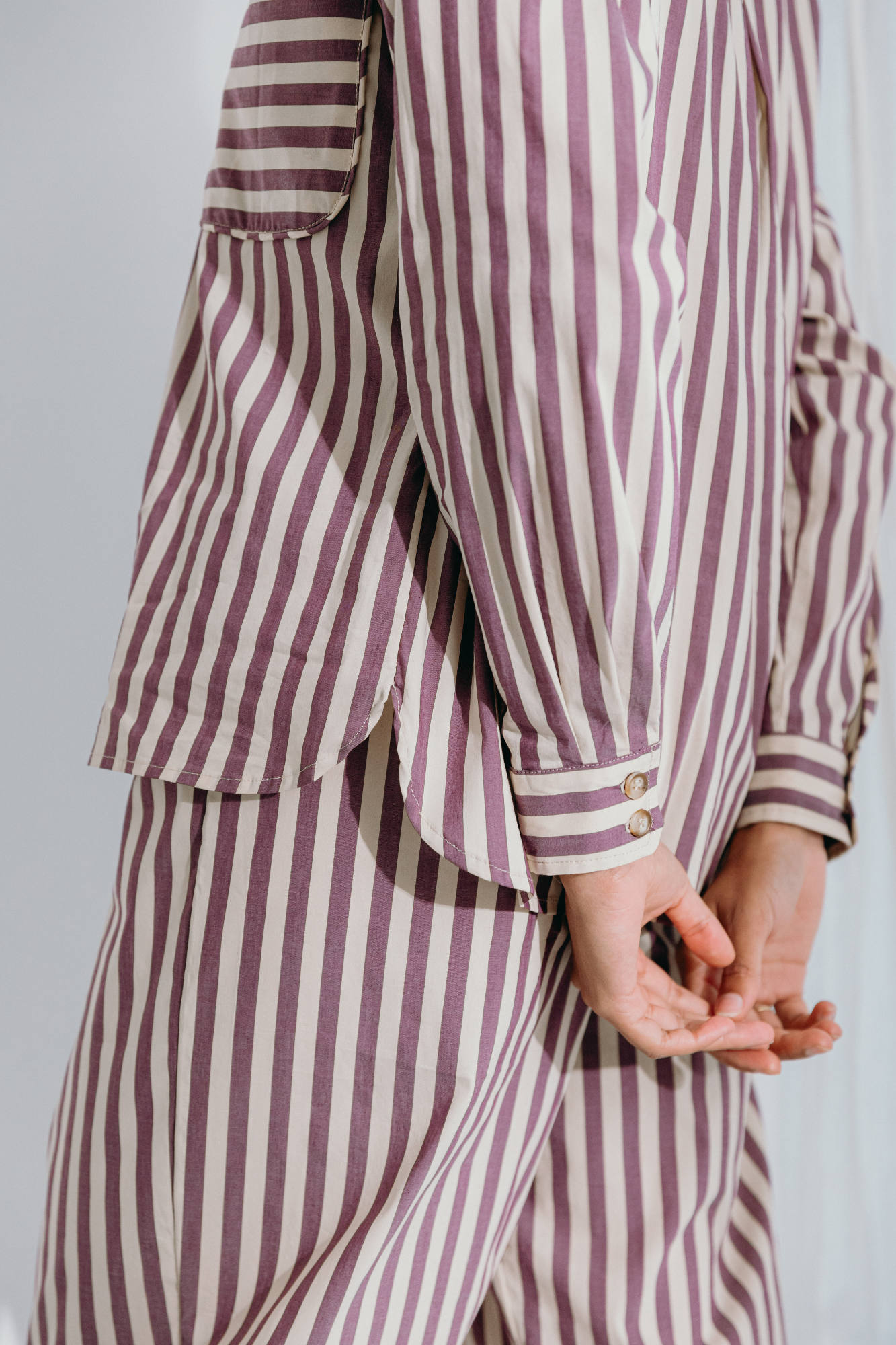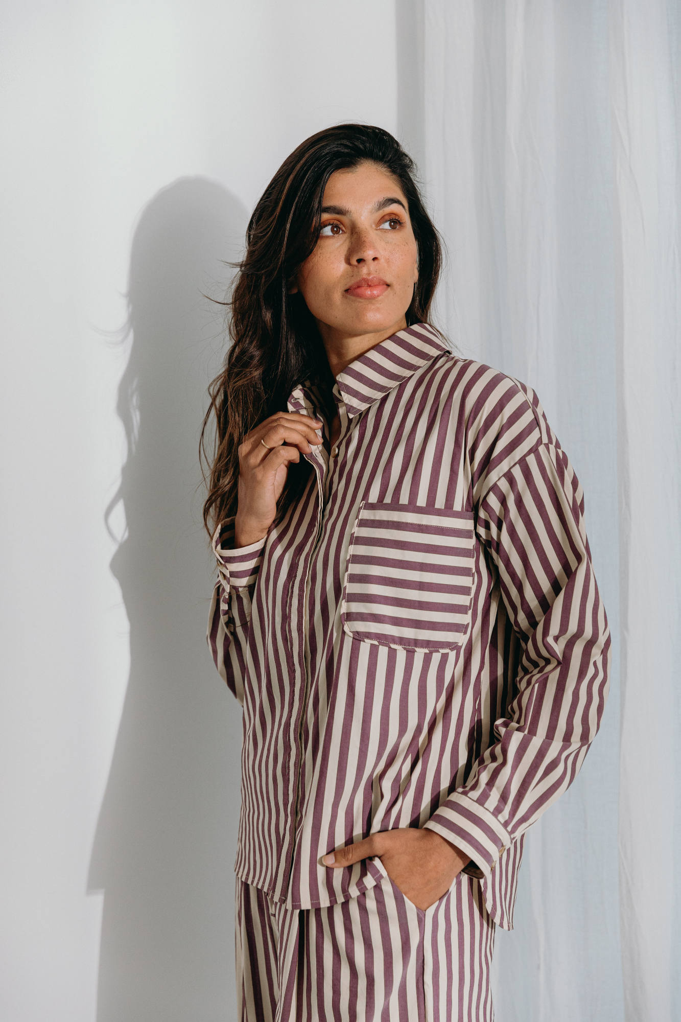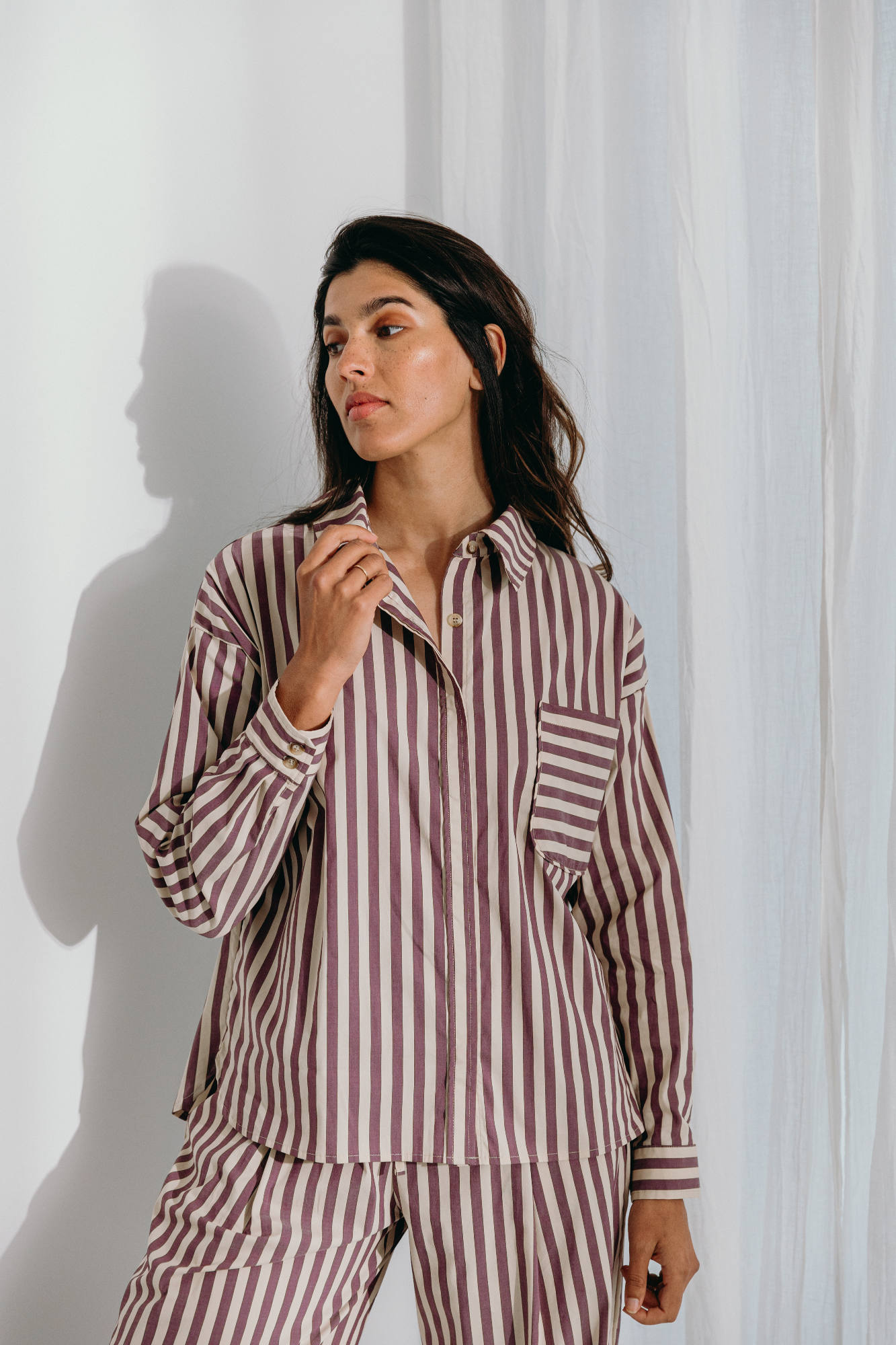 De Koko pyjama is gemaakt van luxueuze biologische stretchkatoenen poplin, die zacht en soepel aanvoelt en moeiteloos comfort biedt. Met opvallende, strakke strepen, een verborgen knoopsluiting, een grote borstzak en dubbele manchetknopen is het ontwerp eenvoudig, tijdloos en elegant verfijnd. Elk detail en de hoogwaardige afwerking benadrukken de hoogwaardige stof en het zorgvuldige vakmanschap. Een klassieke keuze voor ontspannen, stijlvolle avonden.